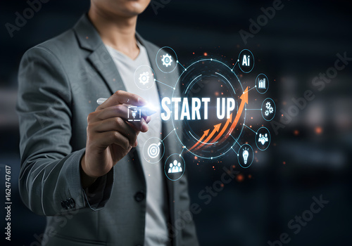 Man writing "START UP" on a virtual screen with a glowing arrow and business-related icons, symbolizing new business growth and innovation.