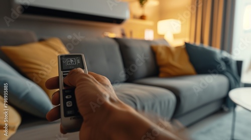 Mans hands with air conditioner remote control