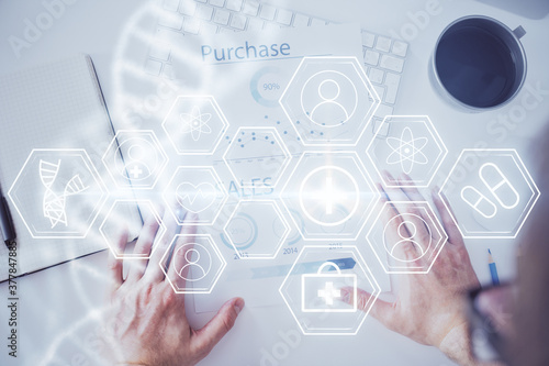 Man's hands working with notes background. Genetic engineering and gene manipulation concept.
