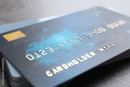 Many credit cards on grey table, closeup