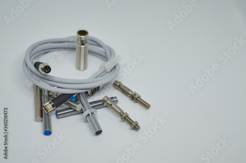 Many Inductive proximity sensor or proximity switch on a white background.