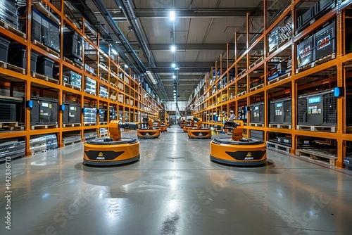many modern robots in action working in a very large bright warehouse, utltra realistic photography, large panoramic
