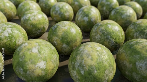Many round objects with mottled green and yellow surfaces.