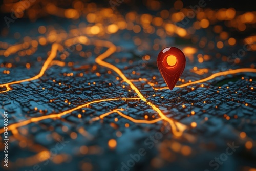 Map highlighting urban area with navigation pin in an illuminated city grid at night