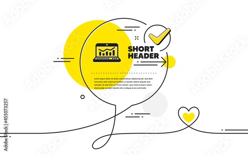 Marketing statistics icon. Continuous line check mark chat bubble. Web analytics symbol. Laptop or Notebook sign. Web analytics icon in chat comment. Talk with heart banner. Vector