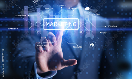 Marketing Strategy and Development Concept Illustrated on Virtual Interface.