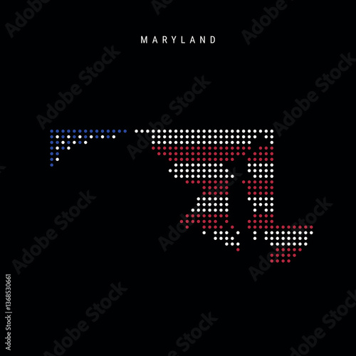 Maryland US state dot pixel map in the colors of the American flag. Flat vector illustration isolated on black background.