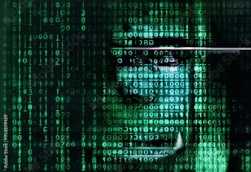 matrix code cashier face composed of falling green digits