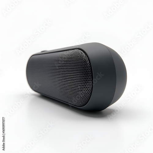 Matte charcoal portable speaker on white seamless background