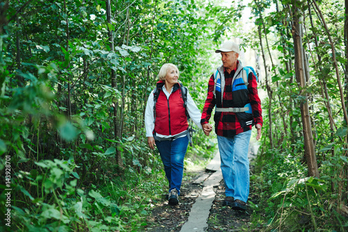 Mature travelers walking down forest path