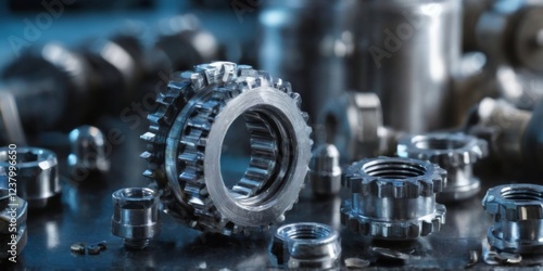 Mechanical Components Collection with Gear, Nuts, Bolts in Workshop Setting Shiny Metallic Finish, Low Angle View.