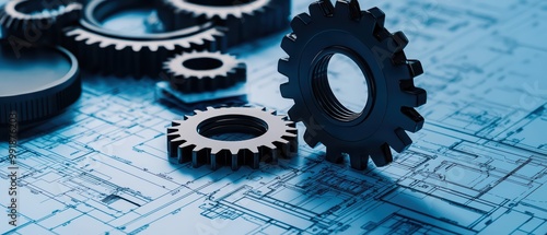 Mechanical gears on a blueprint background, symbolizing engineering and technology.