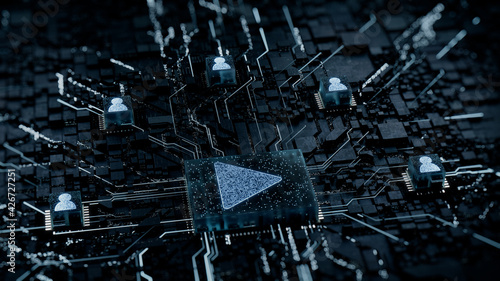 Media Technology Concept with play symbol on a Microchip. White Neon Data flows between Users and the CPU across a Futuristic Motherboard. 3D render.