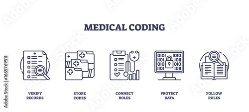 Medical coding icons show verifying records, storing codes, and protecting data, illustrating essential coding processes, transparent background. Outline icons set