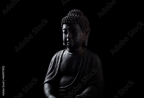 Meditating Buddha Statue isolated on black background. Copy space.