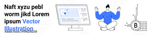 Meditating person in lotus pose, computer screen displaying map, blockchain Bitcoin connection. Ideal for meditation, technology, finance, blockchain, cryptocurrency, networking concepts, website