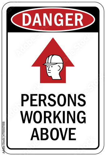 Men working above warning sign and labels
