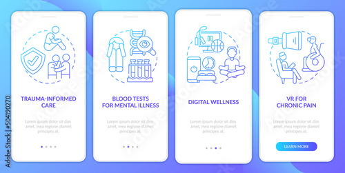 Mental health trends blue gradient onboarding mobile app screen. Walkthrough 4 steps graphic instructions pages with linear concepts. UI, UX, GUI template. Myriad Pro-Bold, Regular fonts used