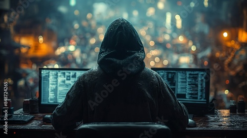 Mesmerizing Depiction of an Anonymous Hacker Engrossed in Deciphering Intricate Code, Captured with Dynamic Lighting and a Wide-Angle Lens for a Realistic and Immersive Widescreen Wallpaper