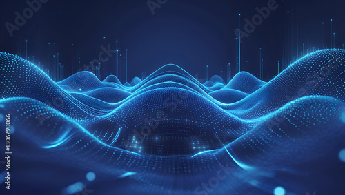 Mesmerizing Digital Art of Blue Light Waves Forming a 3D Abstract Landscape with Rolling Hills and Ocean Swells