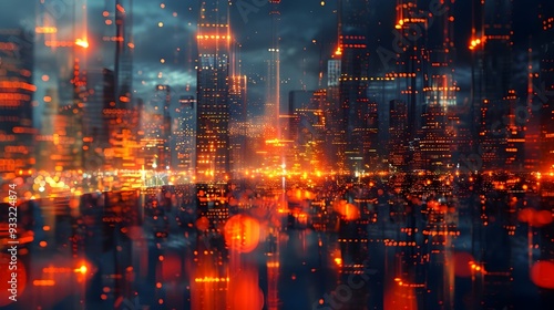 Mesmerizing Digital Cityscape with Glowing Lights and Reflections at Night