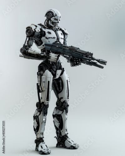 Metal cyborg with blaster on gray background