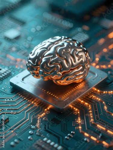 Metallic brain with glowing circuits on processor chip, conceptual AI brain computer interface and high performance artificial intelligence processor core