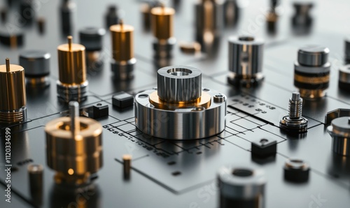 Metallic components arranged on a dark surface.