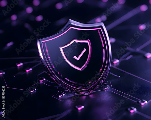 Metallic shield with checkmark on circuit board, signifying digital security