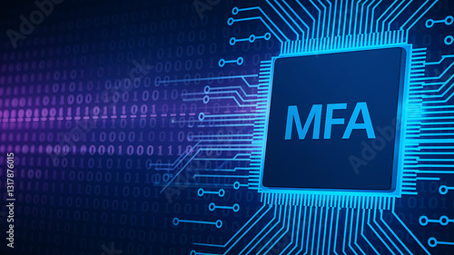 MFA Technology – Multi-Factor Authentication Chip on a Futuristic Blue Circuit Board, cloud computing concept, cloud technology, Saas, Paas, Iaas. AWS Service, OTP security, secure login