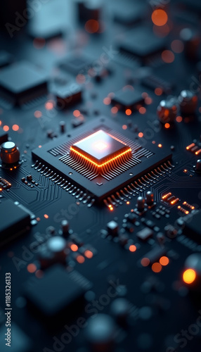 Microchip on Circuit Board with Glowing Lights