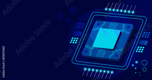 microchip processor on blue tech abstract background reflecting big data, cloud computing, network, artificial intelligence, science, web, etc concept. futuristic background