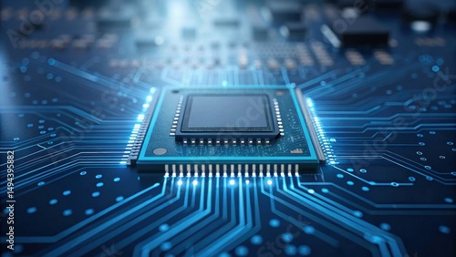 Microchip surrounded by intricate electronic circuits glowing in blue light.