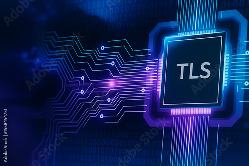 Microchip with TLS inscription surrounded by intricate circuit patterns symbolizing embedded encryption, secure hardware, and digital data protection technology