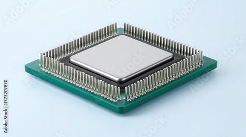 Microprocessor with pins on a green circuit board, symbolizing technology and innovation.