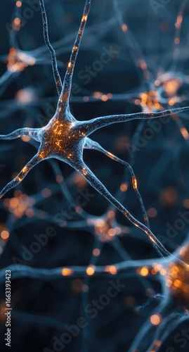 Microscopic view of interconnected neurons, glowing nodes illuminating intricate neural pathways against a dark background