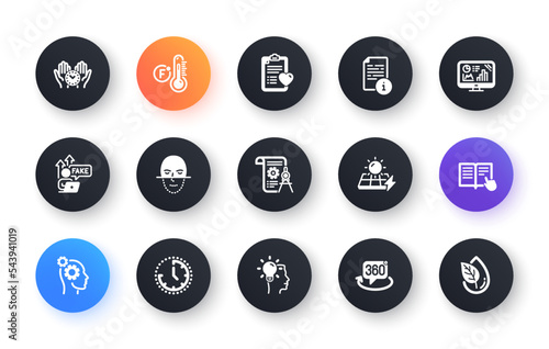 Minimal set of Fahrenheit thermometer, Read instruction and Divider document flat icons for web development. Manual, Thoughts, Solar panels icons. 360 degree, Idea, Safe time web elements. Vector