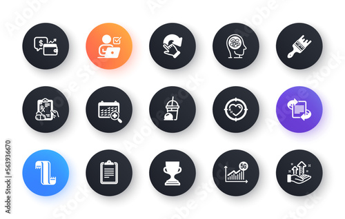 Minimal set of Marketing, Heart target and Stress flat icons for web development. 5g statistics, Medical calendar, Ice cream milkshake icons. Online voting, Wallet, Brush web elements. Vector