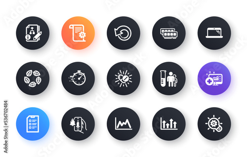 Minimal set of Technical documentation, Medical analytics and Recovery data flat icons for web development. Medical analyzes, Checklist, Algorithm icons. Timer, Laptop, Ram web elements. Vector