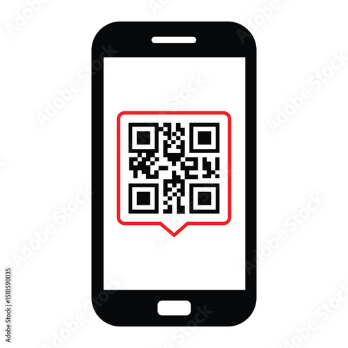 Minimalist black outline smartphone held vertically. Screen displays centered black and white QR code. Straight-on view, clean illustrative style. Isolated on white, no background. Simple digital tech