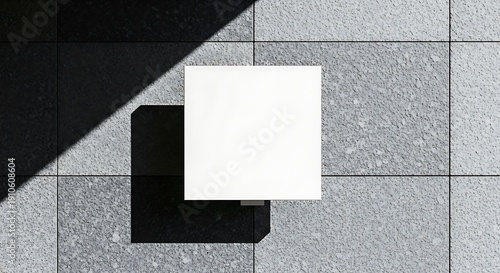 Minimalist composition with a white cube casting a shadow on a tiled surface.