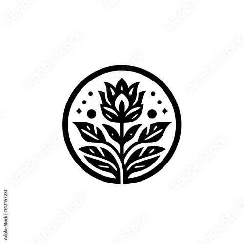 Minimalist Floral Emblem in a Circle, Black and White Design