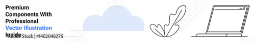 Minimalist laptop line art beside abstract leaf and cloud shapes. Ideal for technology, creativity, productivity, digital marketing, online learning, green tech, flat landing page banner