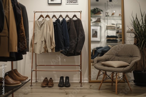 Minimalist room with copper rack, shoes, armchair, mirror, and hanging blouses and trousers, soft lighting and white walls.