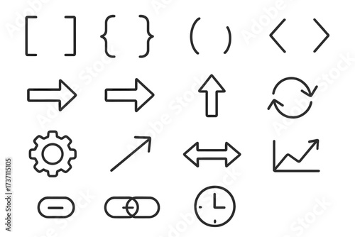 Minimalist thin line icons for web design, app development, business presentations. UI UX outline icon set. Includes arrows, graph, settings, code symbols. Editable stroke vector.