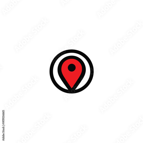 Minimalist vector logo red location pin with a bold black border, centered on a white background. Geometric shapes and clean lines create a symmetrical and visually clear design