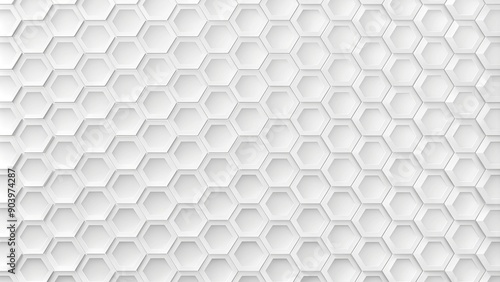 Minimalist white cellular pattern background featuring repeating shiny hexagonal tiles with subtle gradient effect, creating a modern, sleek, and futuristic visual atmosphere.