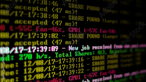 Mining Cryptocurrency process program on display PC. Using Software. Share Found.