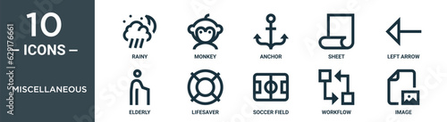 miscellaneous outline icon set includes thin line rainy, monkey, anchor, sheet, left arrow, elderly, lifesaver icons for report, presentation, diagram, web design