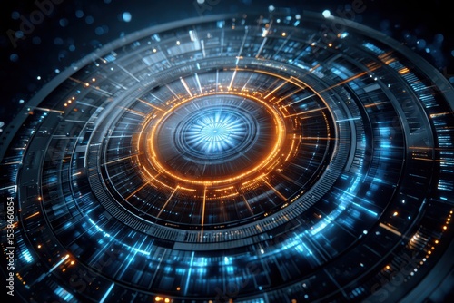 Misinformation in social media algorithms concept. A futuristic circular digital interface with glowing blue and orange lights, representing advanced technology and data visualization.